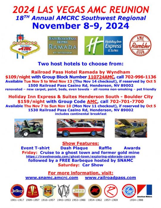 The 2024 Las Vegas AMC Reunion is on.   The show is going to be held on November 8-9 at Railroad Pass Hotel & Casino (www.railroadpass.com) and Holiday Inn Express & Suites. We will have rooms blocked both at Railroad Pass and Holiday Inn Express & Suites.  Railroad Pass Hotel is now a Ramada by Wyndham and features completely renovated all non smoking rooms with new carpets, new beds and new towels.  Holiday Inn Express (https://www.ihg.com/holidayinnexpress/hotels/us/en/henderson/lashd/hoteldetail) is less than two years old and very nice.  The Bullet Train Restaurant (http://www.bullettrainlv.com) is open and has gotten great reviews.